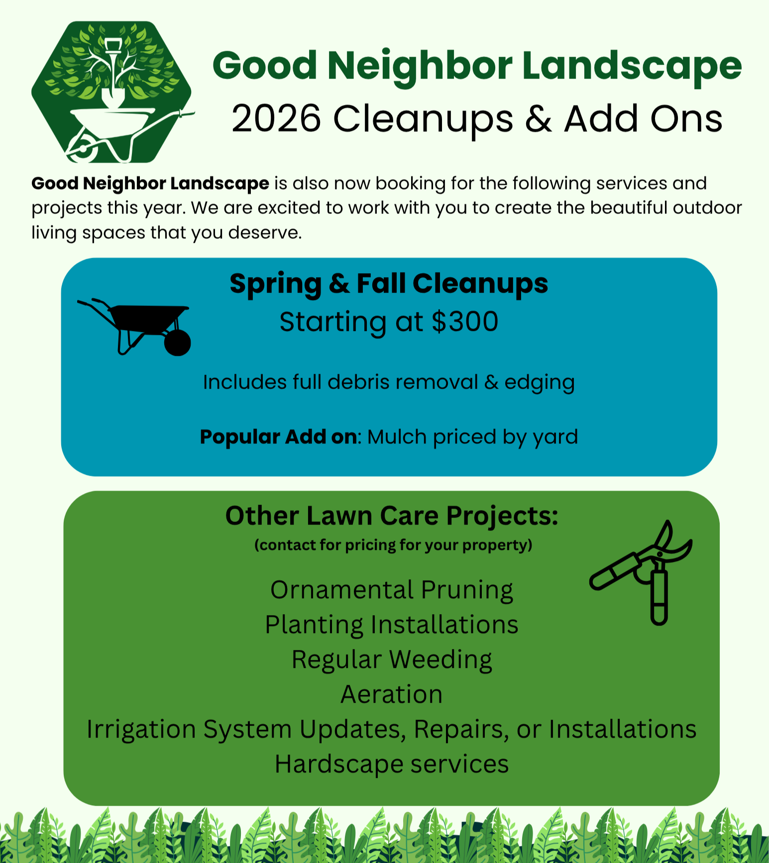 Lawn Care ✳︎ Pruning ✳︎ Planting ✳︎ Cleanups ✳︎ Irrigation ✳︎